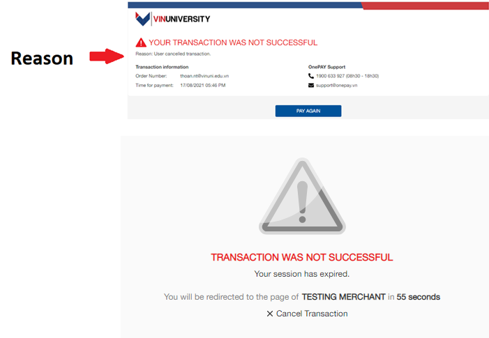 When your transaction is not successful after you input accurate card information, please DO NOT try to make another payment. Please contact the librarian staff at VinUni Library’s circulation desk for further instructions.