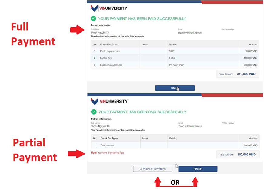 An online receipt will also be sent to your email address registered in VinUni Library system automatically to confirm your payment has been made successfully.